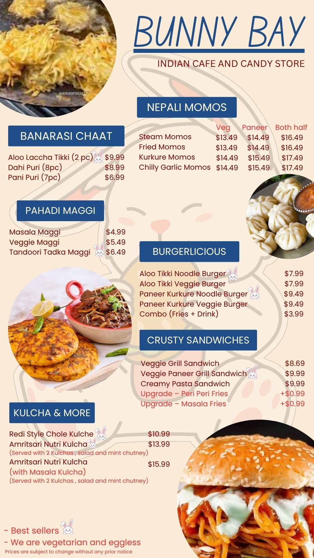 - Burger patty momos spring roll macroni pasta nutri kulcha